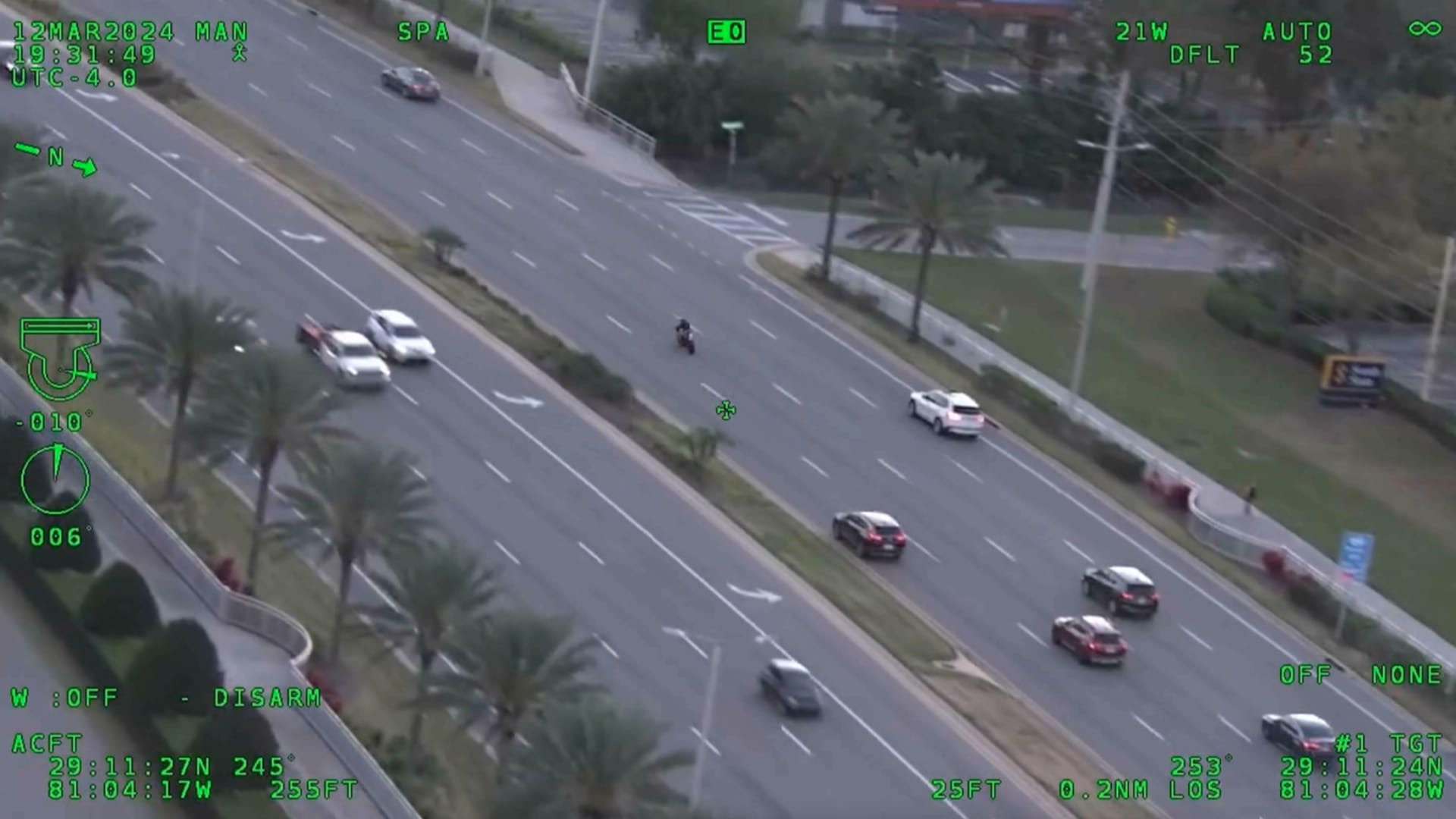 يُظهر مقطع فيديو من مروحية مكتب العمدة جارفيس وهو يراوغ داخل وخارج حركة المرور بسرعات تصل إلى 145 ميلاً في الساعة أي أكثر من 230 كيلو مترا في الساعة، على الطريق السريع الرابع.