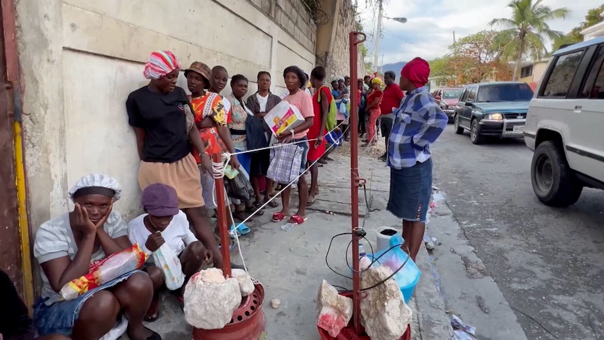 أثناء توزيع المواد الغذائية في الصباح الباكر في أحد الأحياء الفقيرة في هايتي والتي تسيطر عليها العصابات، تصطف العشرات من النساء في طوابير طويلة على أمل الحصول على حصص الإعاشة المقدمة من برنامج الأغذية العالمي.